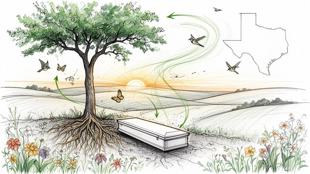 You won't find any concrete burial vaults or metal liners here. That’s a key distinction. The absence of a vault allows the body to be in direct contact with the earth, which is essential for the natural decomposition process. This direct return is the heart of a green burial. For a full breakdown, take a look at our guide on the steps involved in planning a Texas natural burial.